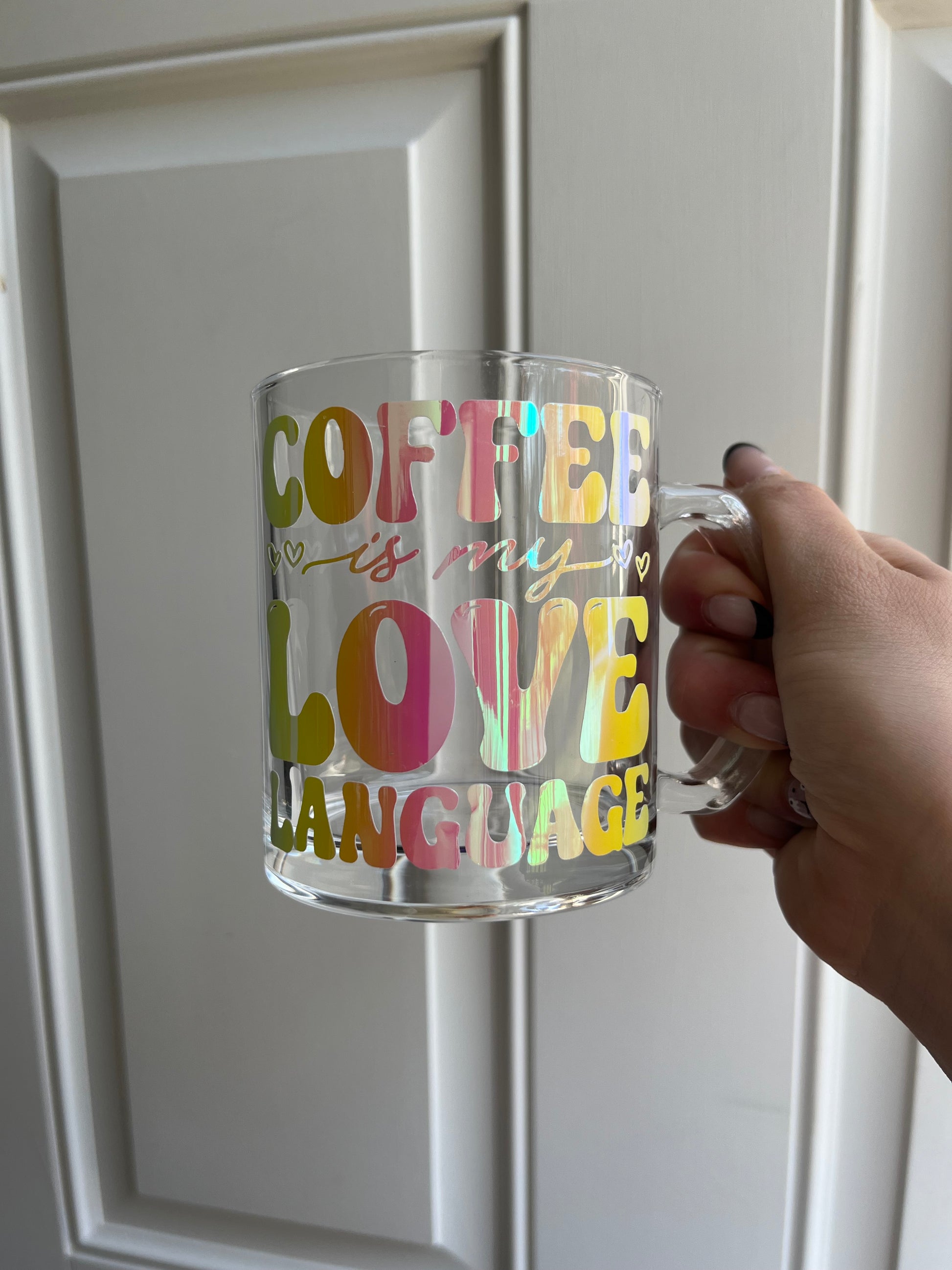 Is coffee your love language? This glass mug is perfect to enjoy a cup of coffee, hot chocolate or any other beverage of your choice in style! The glass is durable and thick.